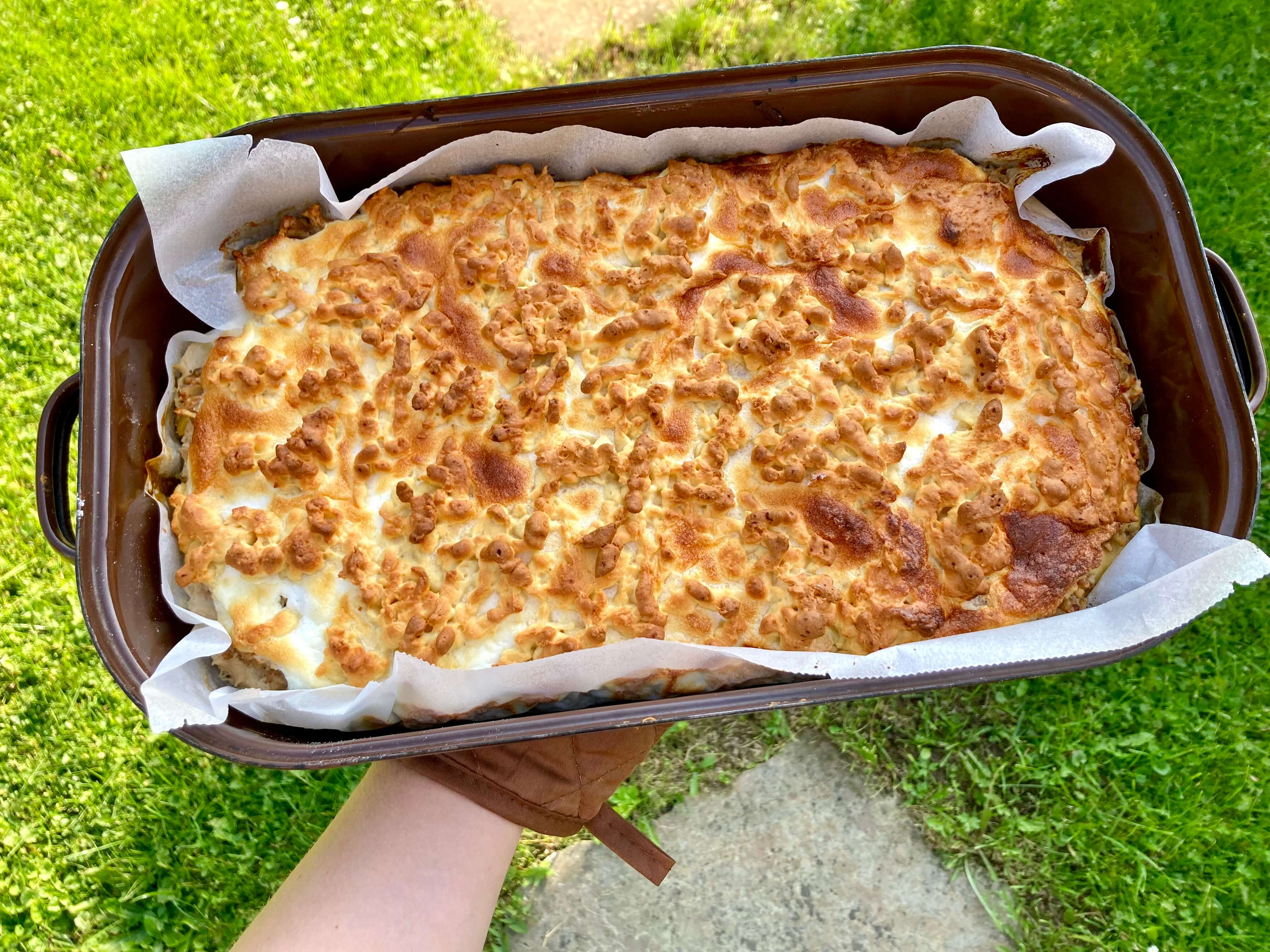- Jablka nastrouhej nahrubo, vymačkej přebytečnou šťávu, přidej skořici a ořechy, promíchej a navrstvi na připravené těsto