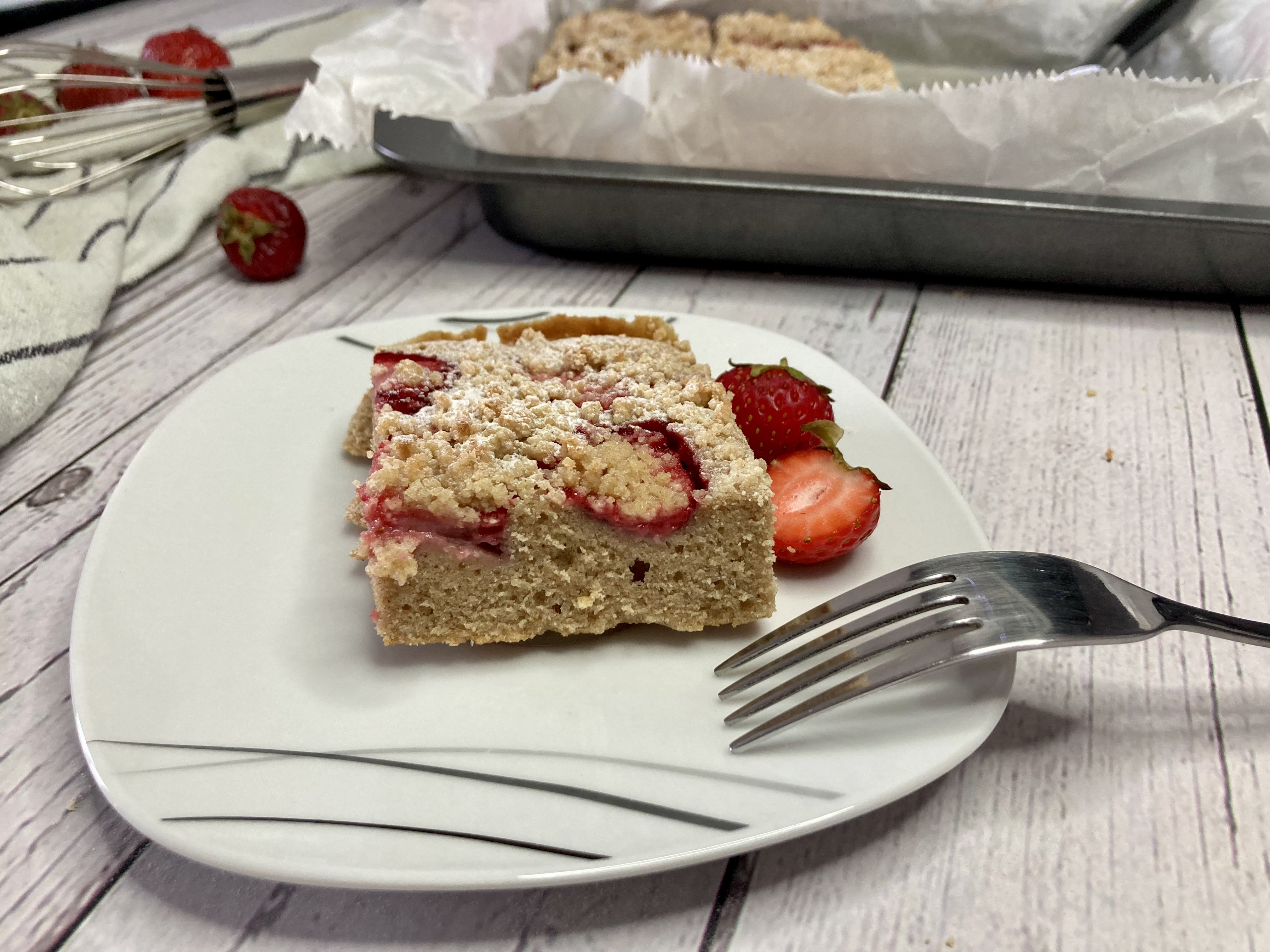 - ingredience na drobenku smíchej v misce (nejlépe rukama) a posypej těsto s jahodami